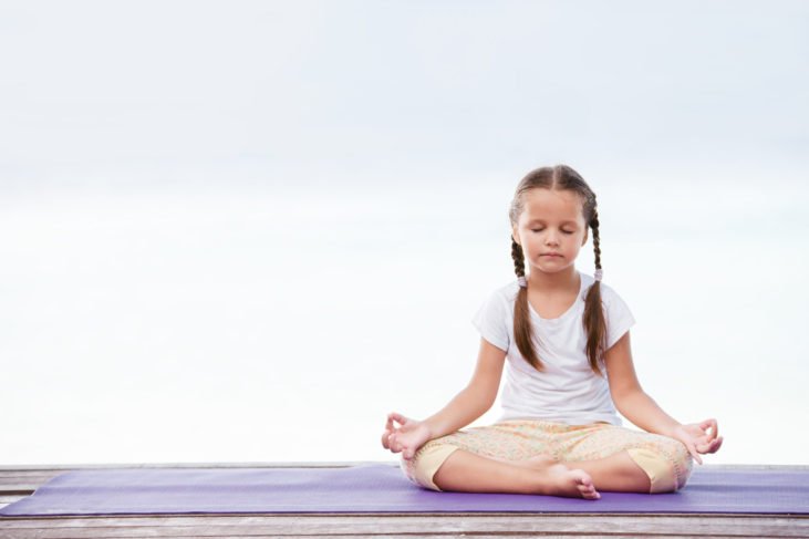 Child doing exercise on platform outdoors. Healthy lifestyle. Yoga girl